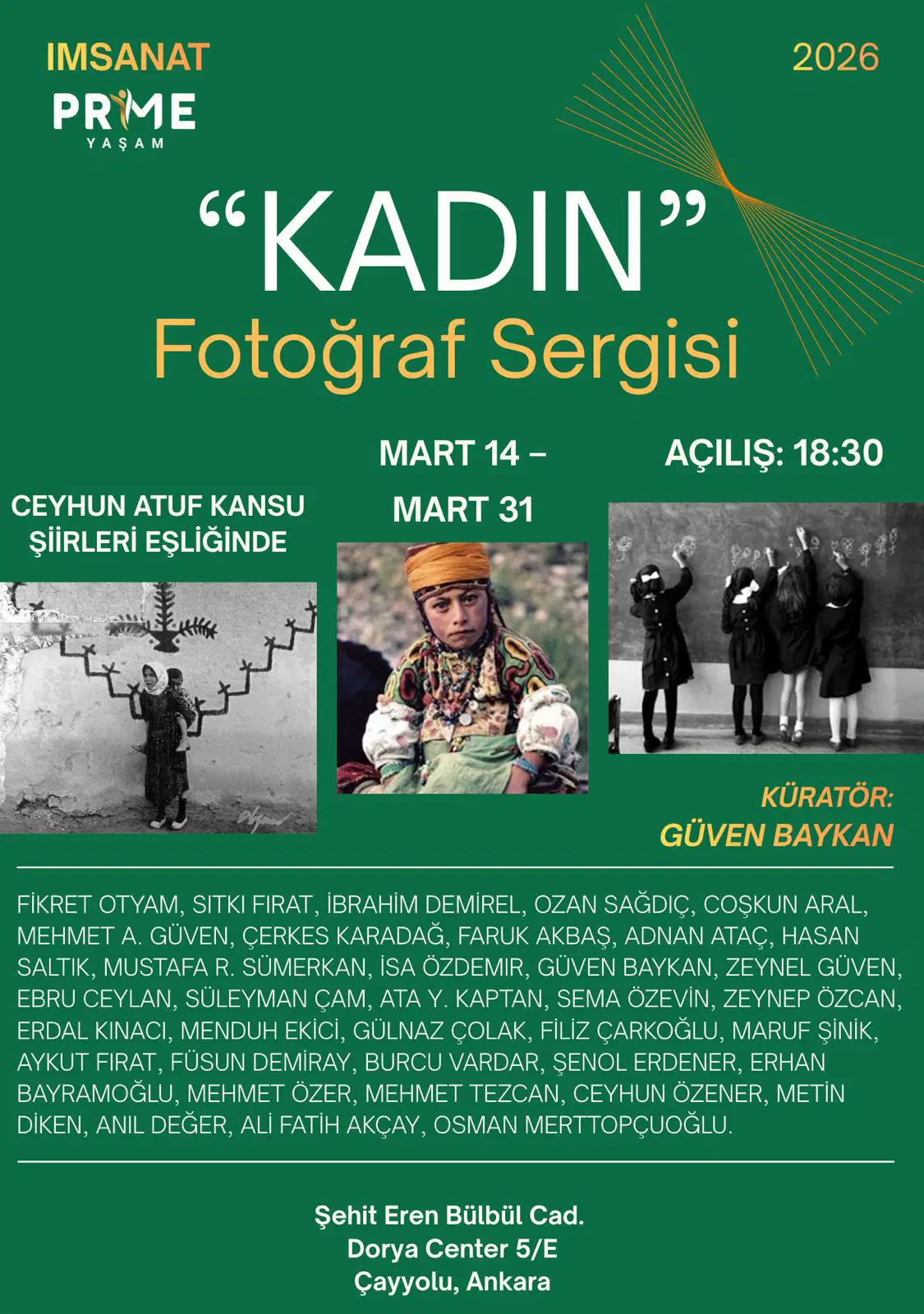 MSANAT Prime Yaşam tarafından düzenlenen sergi, 36 sanatçının eserleriyle kadın hafızası ve toplumsal yaşamı fotoğrafın diliyle anlatıyor; 14-31 Mart tarihleri arasında Ceyhun Atuf Kansu’nun şiirleri eşliğinde ziyaret edilebilecek.