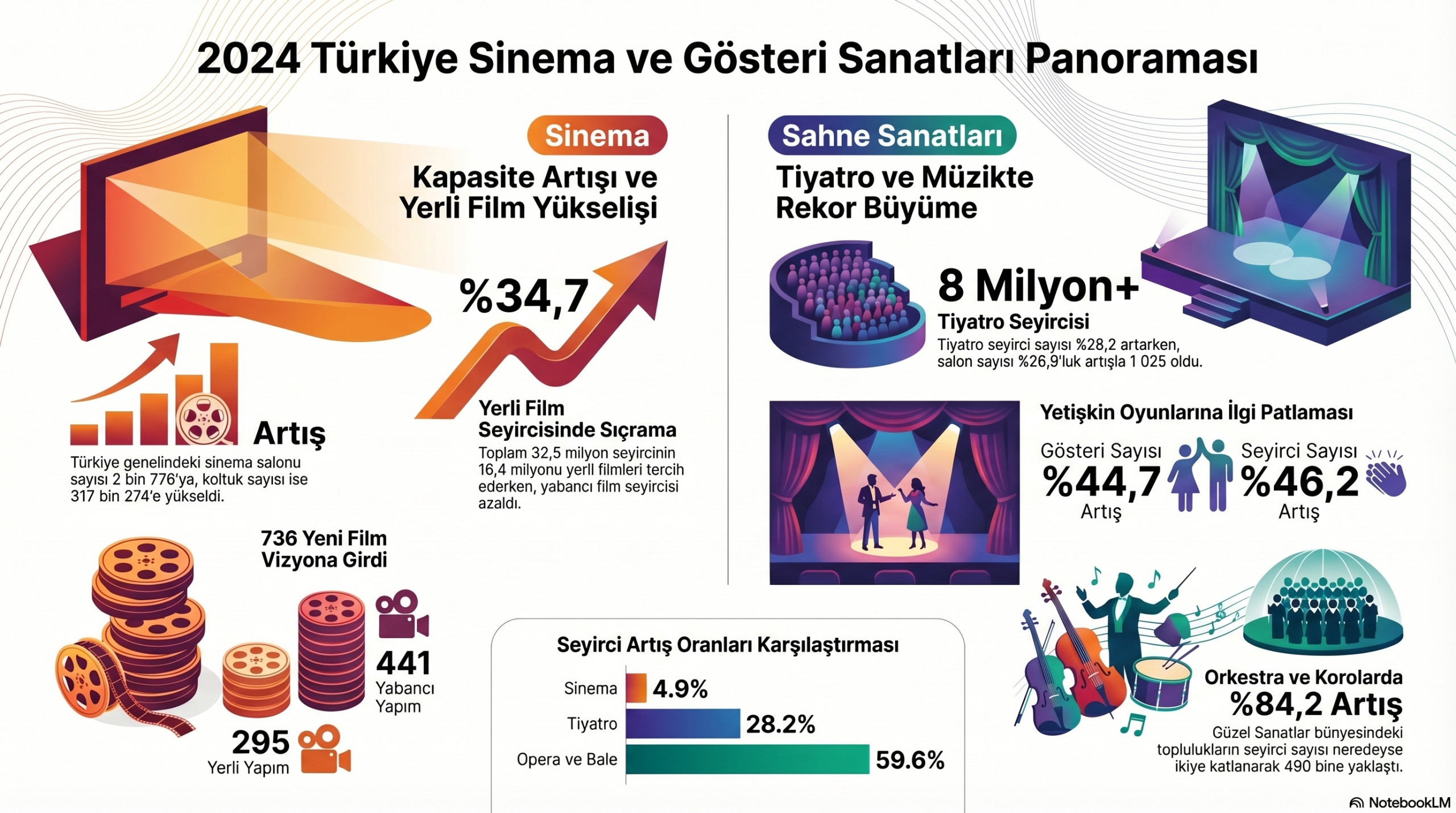 Türkiye’deki 2024 yılı sinema ve gösteri sanatları verileri, kültür-sanat faaliyetlerinde genel bir büyüme eğilimi olduğunu ortaya koymaktadır. Sinema sektörü hem salon sayısı hem de izleyici kitlesi bakımından gelişim gösterirken, yerli yapımlara olan ilginin yabancı filmleri geride bırakması dikkat çekmektedir. Tiyatro alanında ise salon sayısındaki %26,9’luk artışla birlikte sergilenen eser sayısı ve seyirci katılımında ciddi bir yükseliş kaydedilmiştir. Devlet Tiyatroları, opera, bale ve orkestra gibi alanlarda da gösteri ve ziyaretçi sayılarında rekor düzeyde artışlar yaşanmıştır. Özellikle yetişkin tiyatro izleyicisi ve müzik topluluklarına olan talebin katlanarak büyümesi, sanat dallarının toplumda daha geniş yer bulduğunu kanıtlamaktadır. Bu istatistikler, ülkedeki kültürel etkinlik hacminin ve fiziksel kapasitesinin bir önceki yıla göre her branşta güçlendiğini simgelemektedir.